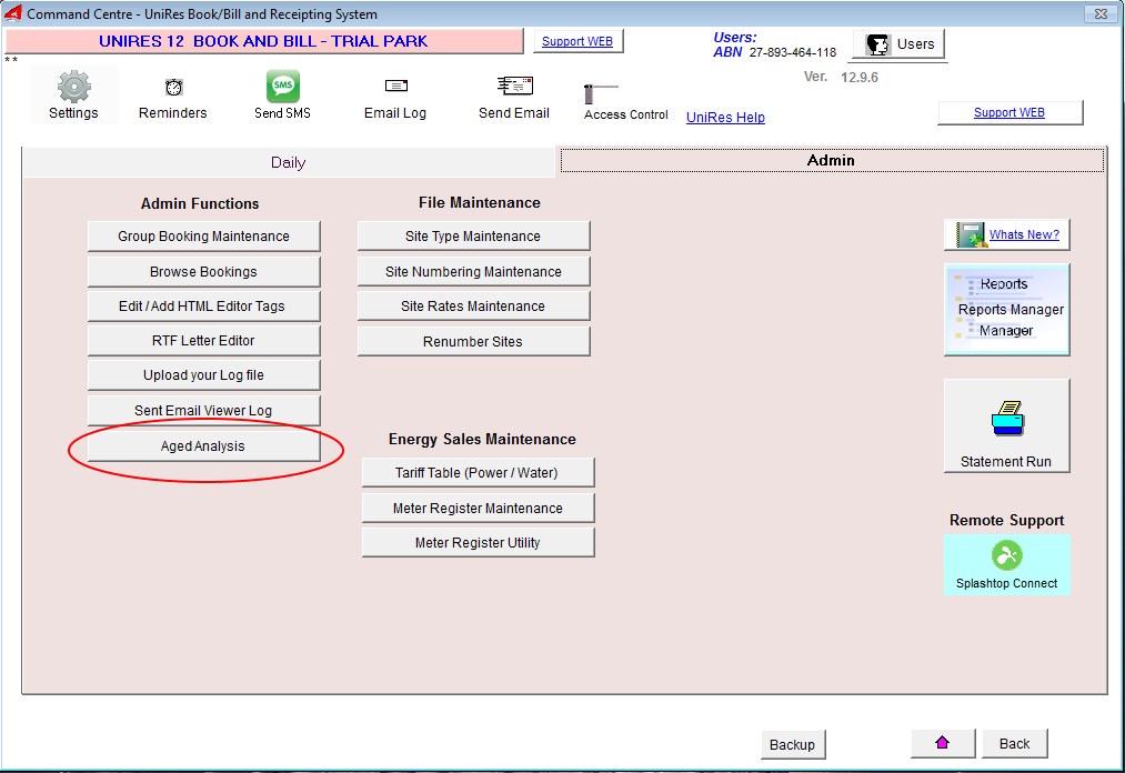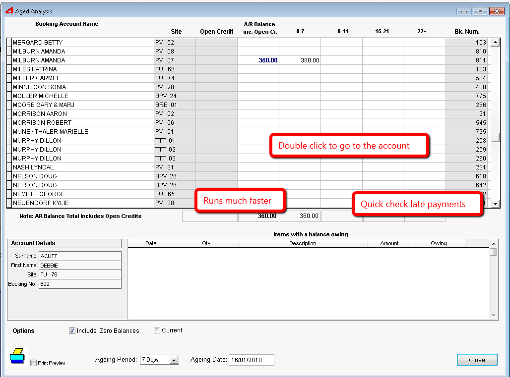 This is a specialised report commonly used in parks with long term tenants where transactions are posted in advance of payment. This report shows how old a transaction posting is and groups the posted amounts into aging periods of 7 days, 14 days or 30 days. You can also use this report to correct any Balance Forward and direct access to the Charges System is possible.