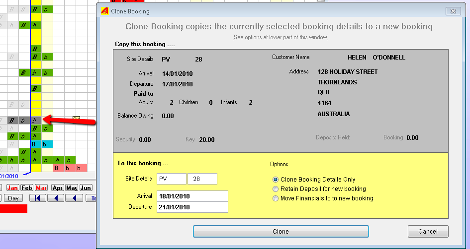 Copy and Paste - Deposits Only Forward: This is the same as 1. above, except that deposits are moved to the new booking. This is handy if your client wishes you to retain their deposit for "next year" . The deposit is reversed from the booking being copied and placed in the appropriate deposit field in the new booking.