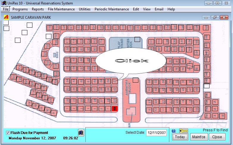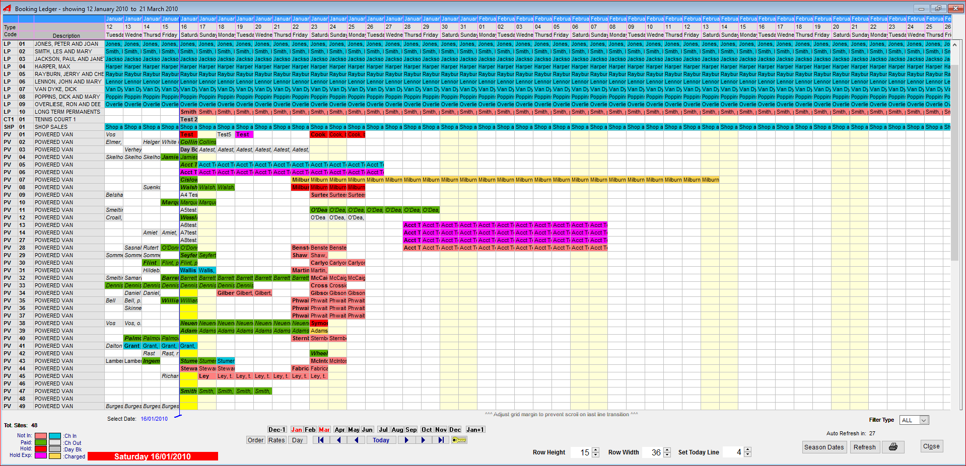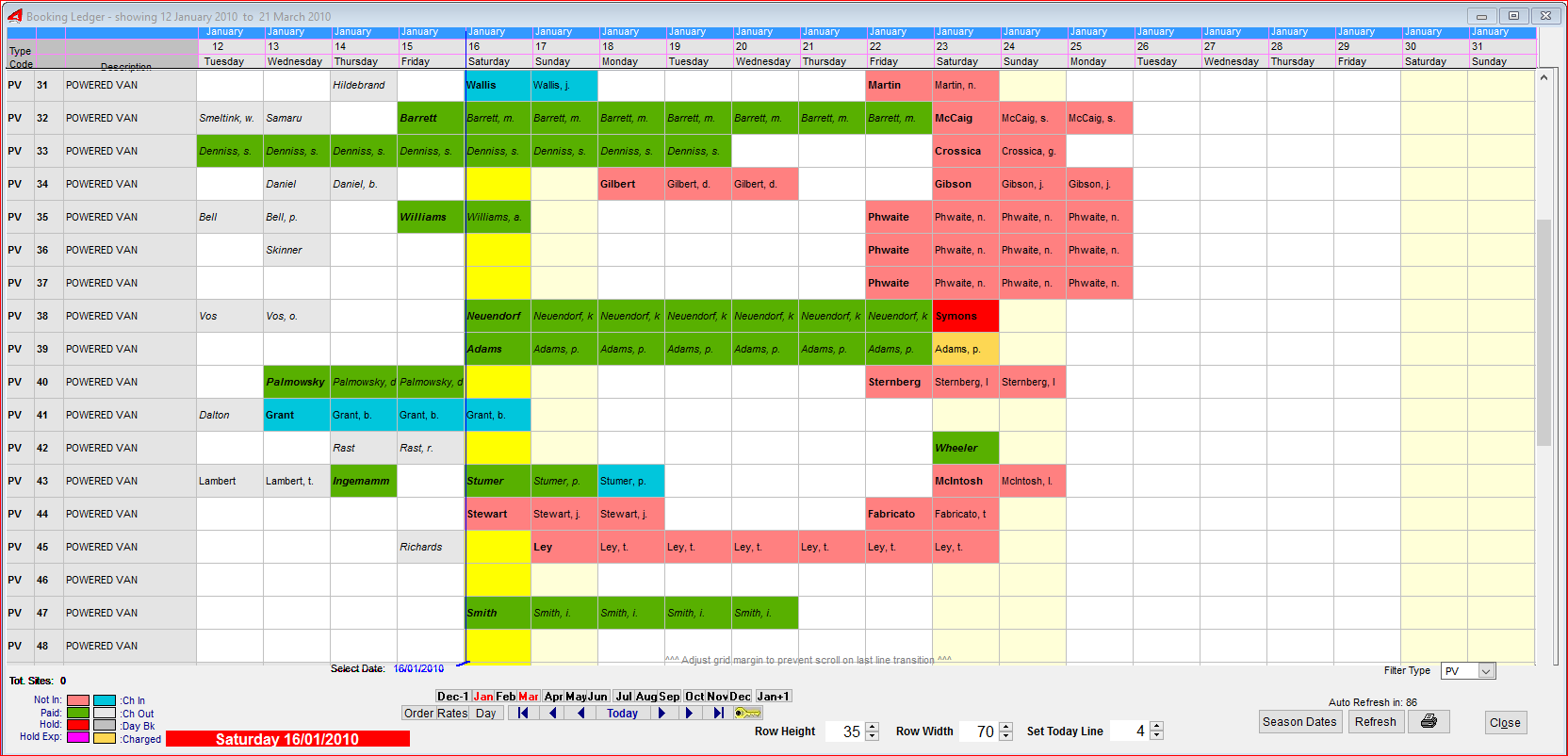 From the Booking Ledger; double click on a vacant square in the Grid - The ledger is adjustable, so you can display more sites and/or more weeks in advance. Right click to access a drop down menu or double right click to make a booking or group booking.
