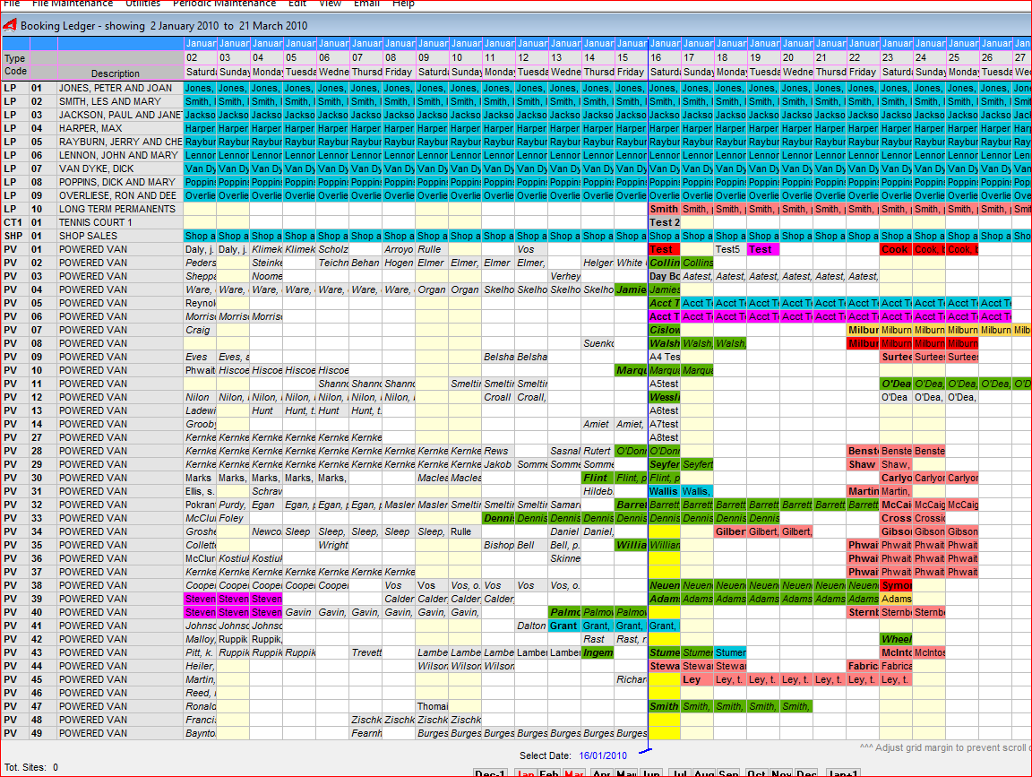 As you move the mouse pointer around the booking ledger grid, you will see a white square move around in front of the pointer. If you pause for a second, as you stop on a booking line, the occupants Surname, First name, From, To and paid to info is displayed.