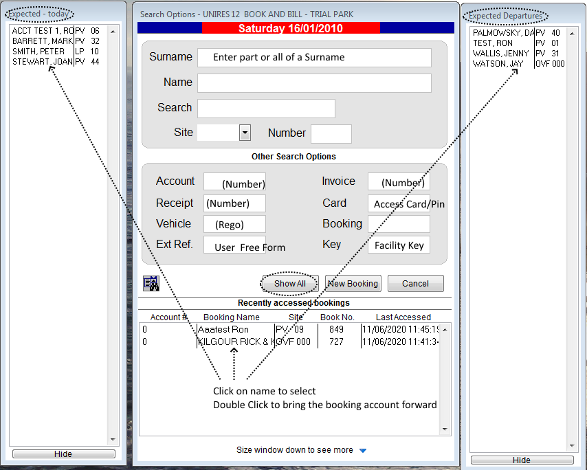 The quick lists are optionally displayed on both sides of the Search Options window. To activate the quick lists (both the Expected Arrivals and the Expected Departures quick lists) click on the All button next to the Search Options Window Surname field.