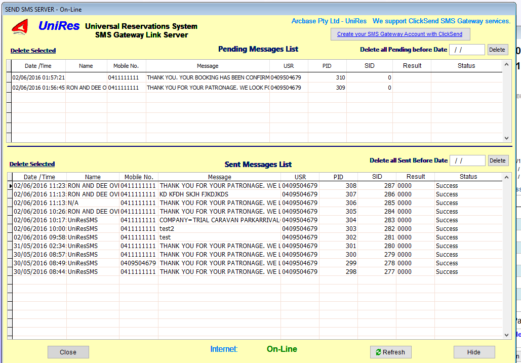 The SMS facility is available in UniRes version 11.3.160 onwards.
